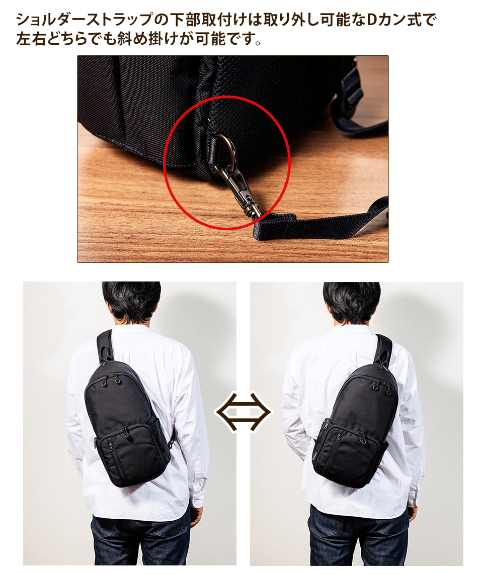 ●ショルダーストラップの下部取付けは取り外し可能なDカン式で左右どちらでも斜め掛けが可能です。